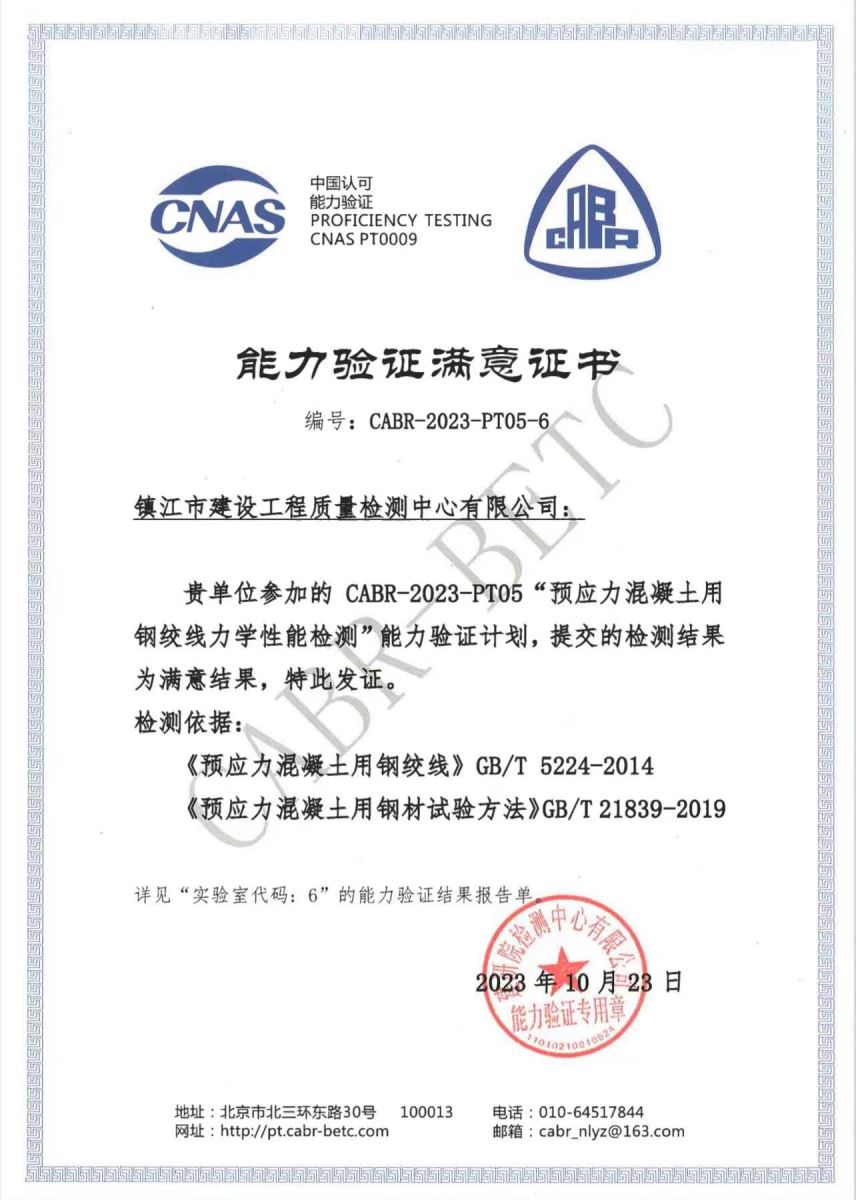 今年6月,检测中心参加了由建研院检测中心组织实施的“预应力混凝土用钢绞线力学性能检测”能力验证并于近日收到评价结果,显示为“满意”。