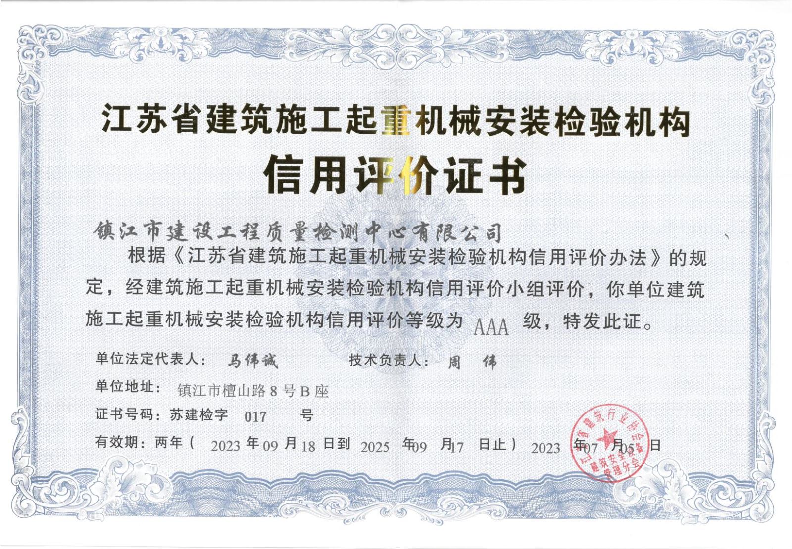 江苏省建筑施工起重机械安装检验机构信用评价证书